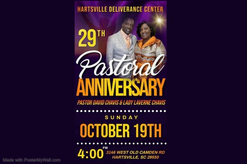 Hartsville deliverance center is celebrating their 29th pastoral anniversary Sunday, October 19th at 4pm. Let's join them as they celebrate pastor David Chavis and lady laverne chavis. The address is 3 1 4 6 West Old Camden Road, Hartsville South Carolina.