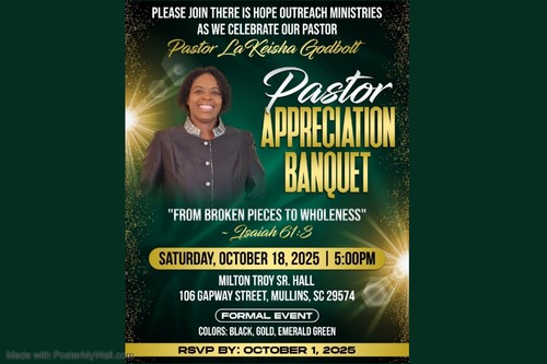 There is hope outreach ministries celebrating their pastor, LaKeisha Godbolt, October 17th. The address is Milton Tory Sr. Hall, 106 Gap way street, Mullins South Carolina. Lets join them in celebration