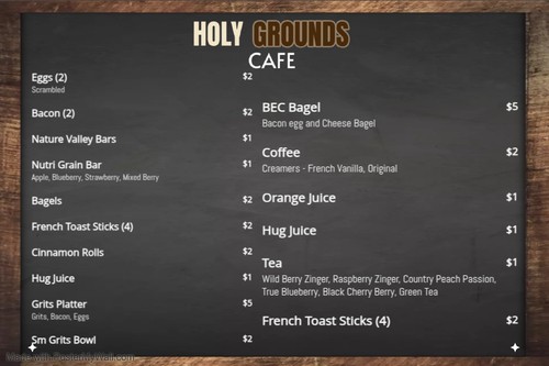 Want some breakfast? Join us in the morning from 8:50 am to 9:15 am for Holy Grounds in the brick building.