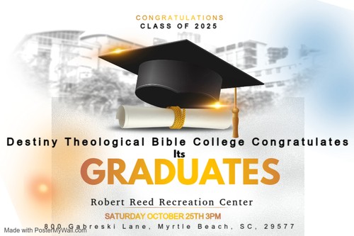 Come support our class of 2025 graduates of destiny theological bible college, october 25th at 3pm. The address is 800 Gabreski lane, myrtle beach south south carolina, at the robert reed recreation center.