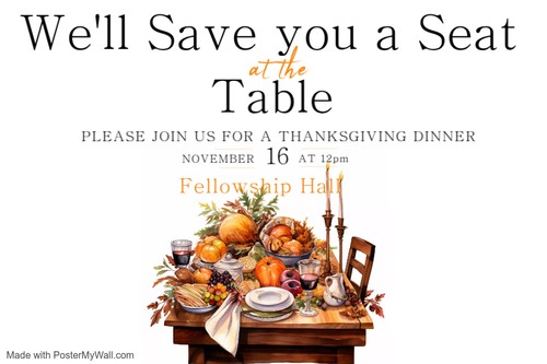 You are cordially invited to join us for our thanksgiving dinner November 16th in the fellowship hall, immediately after services. We would love to eat good food and celebrate thanksgiving together as a church family.